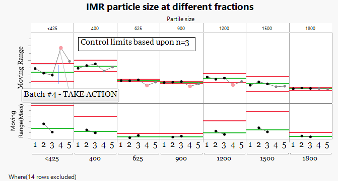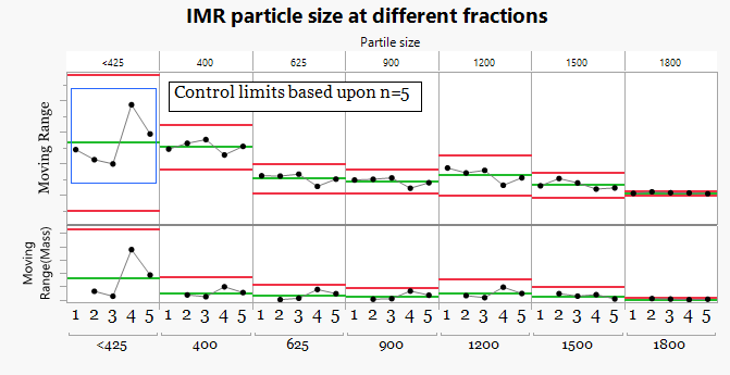 To better understand the process behavior, the particle size fractions were evaluated using Individual and Moving Range behavior charts. In this first view, control limits were calculated using all five batches.While the data are now visualized across a timeline, including all batches in the limit calculation masks the presence of unusual variation and reduces the sensitivity of the chart to detect meaningful differences between batches.